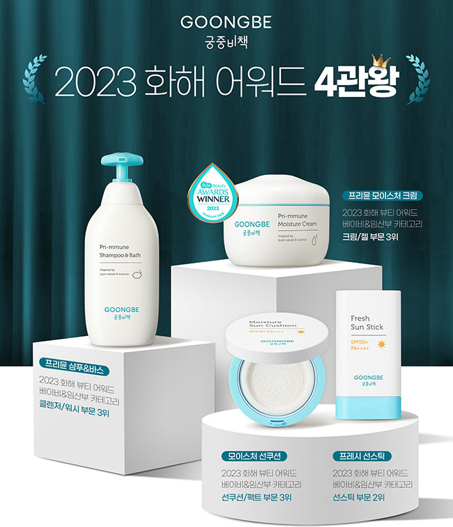 궁중비책은 2023 화해 뷰티 어워드 베이비&임산부 카테고리 내 총 4개 부문에서 수상했다. 수상 제품은 ▲프리뮨 샴푸&바스(클렌저/워시 부문) ▲프리뮨 모이스처 크림(크림/젤 부문) ▲프레시 선스틱(선스틱 부문) ▲모이스처 선쿠션(선쿠션/팩트 부문)이다.