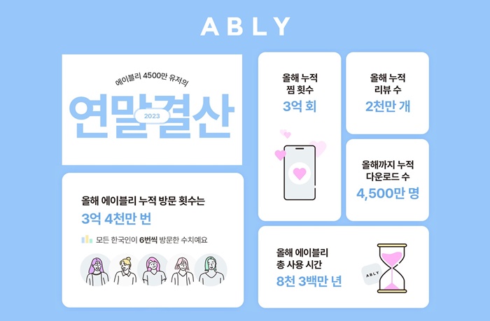 에이블리코퍼레이션(대표 강석훈)이 운영하는 스타일 커머스 플랫폼 ‘에이블리’가 올해 1월부터 12월 4일까지 사용자 빅데이터를 기반으로 ‘2023 에이블리 연말 결산’을 21일 발표했다.