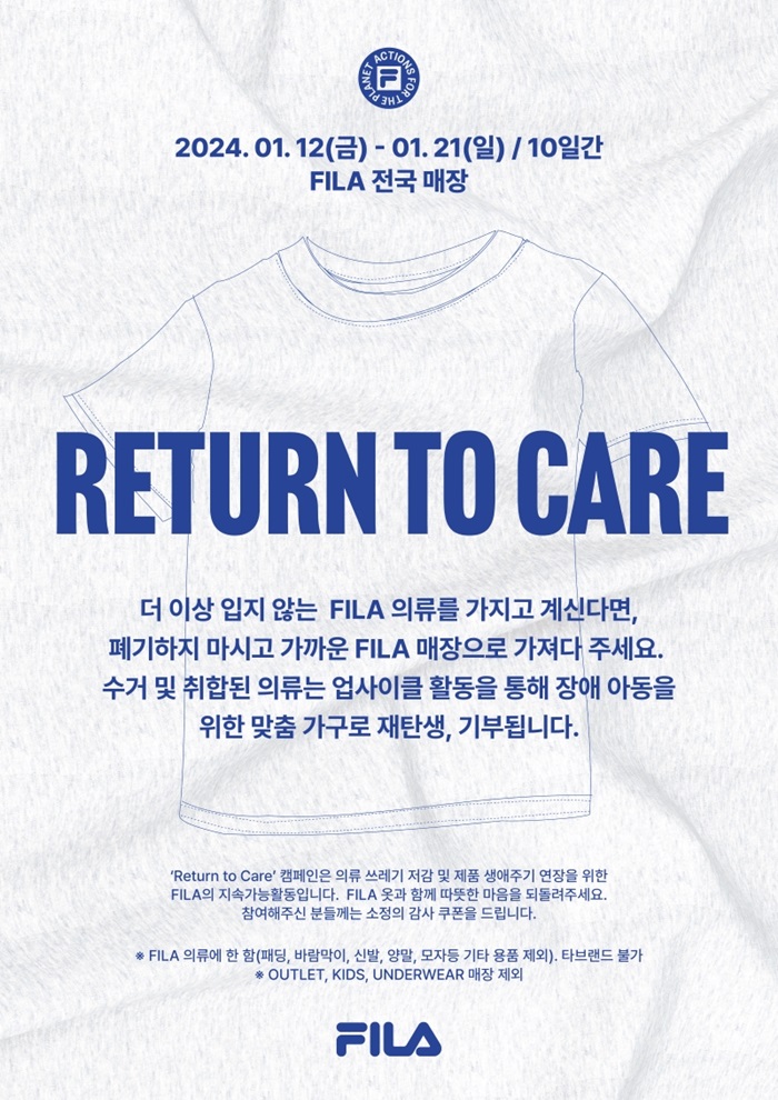 특히 이번 캠페인은 고객과 휠라코리아 임직원이 함께 참여하는 사회공헌활동으로, 고객은 오래되거나 더 이상 입지 않는 휠라 의류(패딩, 바람막이, 신발, 양말, 모자 등 기타 용품 제외)를 매장에 기부해 직접 참여할 수 있다. 이달 12일부터 21일까지 10일간 아울렛 매장을 제외한 전국 휠라 오프라인 매장에서 진행된다.