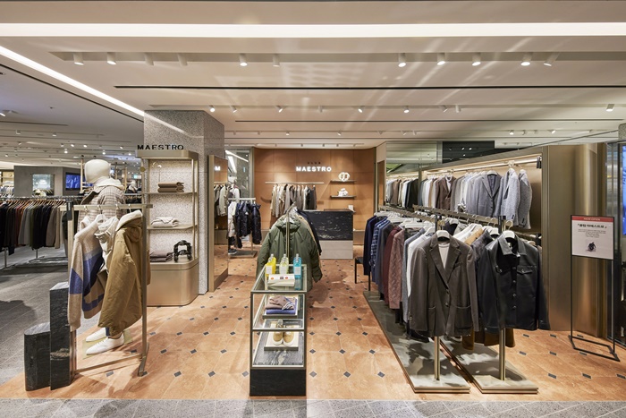 클럽 마에스트로 매장 내부 인테리어는 전체적으로 금색 구조물과 코랄(Coral, 산호색) 색상을 포인트로 활용해 모던하면서도 클래식한 고급 브랜드 이미지를 표현했다. 내부 구성은 △알베로존 △수입클래식존 △수입캐주얼존 등으로 구분해 고객 니즈 중심의 편안한 쇼핑이 될 수 있도록 동선을 계획했다.