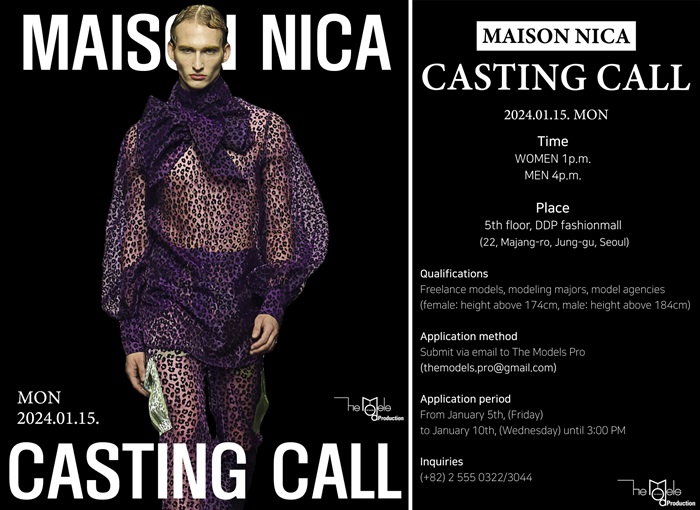 모니카 고 디자이너가 전개하는 브랜드 ‘메종니카(MAISON NICA)’가 2024 F/W 서울패션위크를 위한 ‘캐스팅 콜’을 개최한다.