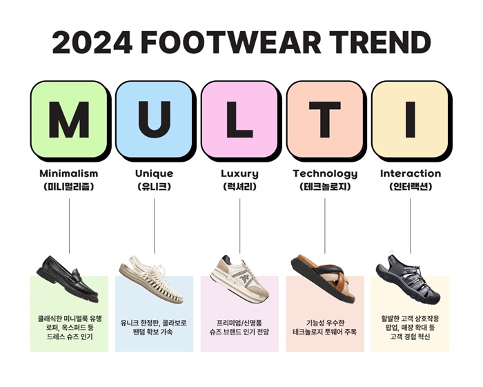 다변화되는 고객 니즈에 따라 기능성과 패션 두가지 요소를 멀티로 충족시키며 일상과 취미생활, 비즈니스 등 라이프스타일 전반의 경계를 넘나드는 브랜드와 제품이 떠오를 것이라는 전망과 함께, 다채로운 콜라보 등 변화무쌍한 풋웨어 시장의 트렌드 예측을 담은 키워드다. ‘MULTI’는 미니멀리즘(Minimalism), 유니크(Unique), 럭셔리(Luxury), 테크놀로지(Technology), 상호작용(Interaction)을 뜻하는 영어 단어의 앞 글자에서 따왔다.