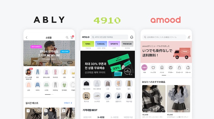 왼쪽부터 여성 패션플랫폼 에이블리, 남성 패션 앱 4910(사구일공), 일본 쇼핑앱 아무드
