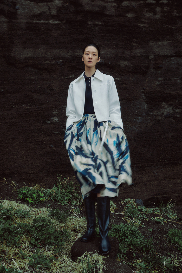 풍성한 실루엣의 화이트 코튼 트렌치코트와 클린한 외관의 버뮤다팬츠 조합에 레드 컬러의 니트 풀오버로 트렌디한 포인트를 준 룩과 번진 자국을 모티브로 한 그래픽 패턴이 적용된 집업 원피스, 볼륨 스커트 등을 활용해 우아하고 세련된 착장을 선보였다.