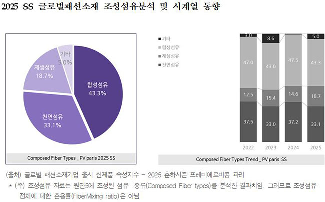 글로벌 패션소재기업이 2025년 춘하용으로 출시한 신제품에서 재생섬유 사용비중이 대폭 상승한 것으로 조사됐다.