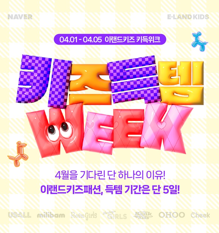 이랜드리테일(대표 윤성대)의 패션 브랜드 운영법인 이랜드글로벌에서 전개하는 인기 아동복 브랜드가 4월 1일부터 5일까지 네이버와 함께 24SS 봄맞이 혜택을 담은 연합전 ‘키득위크’를 진행한다.