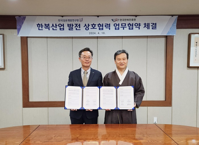 한국섬유개발연구원(호요승 원장)과 한국한복진흥원(박후근 원장)은 16일 한국섬유개발연구원 대회의실에서 한복산업분야 상호협력과 발전을 위한 업무협약을 체결했다.