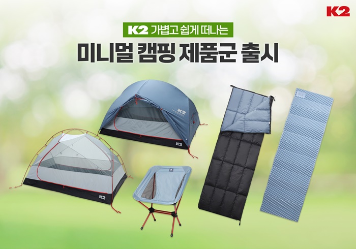 이번에 선보이는 K2 미니멀 캠핑 제품군은 가벼운 무게와 손쉽게 사용이 가능한 제품들로 2인용 텐트, 휴대용 의자, 침낭, 슬리핑패드 등으로 구성되며, 봄, 여름, 가을 3계절용으로 선보인다.