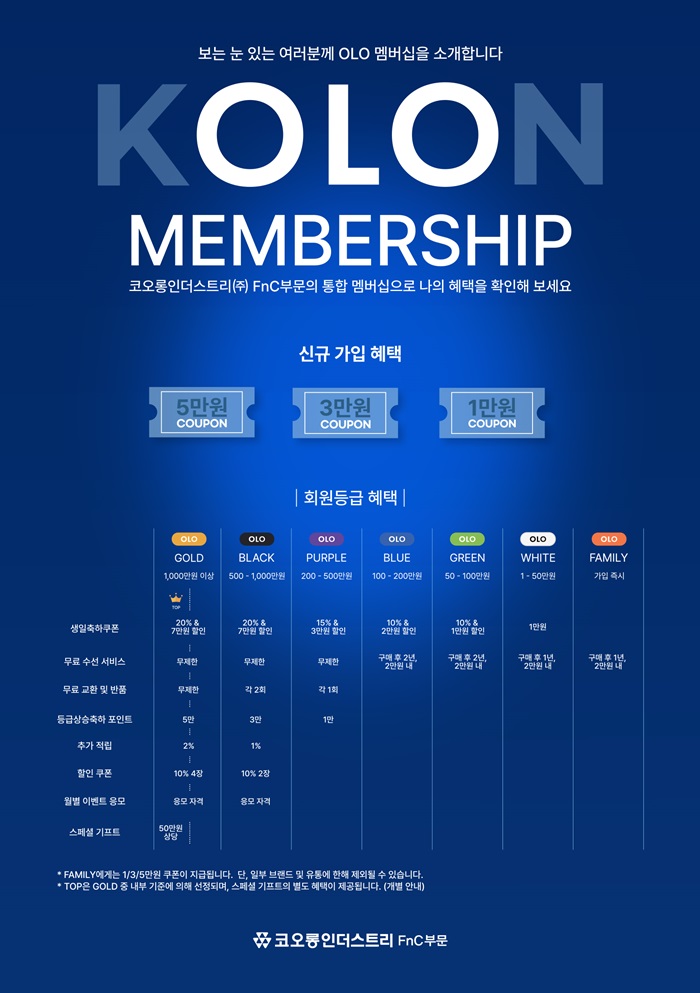 코오롱FnC는 OLO멤버십으로의 개편을 통해 기존 6단계 등급을 7단계로 늘렸다. 구매 이력이 없는 일반 고객은 패밀리 등급으로 명칭을 변경하고, 신규 가입 시에는 온/오프라인에서 사용할 수 있는 1, 3, 5만원 쿠폰을 지급한다.