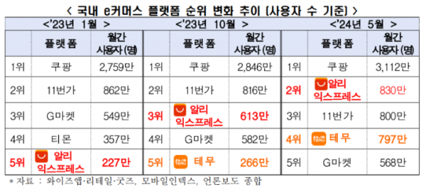 2023년 1월 국내 e커머스 플랫폼 순위는 쿠팡 1위, 11번가 2위, G마켓 3위, 티몬 4위, 알리익스프레스 5위(2018년 한국 진출)로 1~4위에 한국 기업들이 포진했었으나, 2024년 5월에는 쿠팡 1위, 알리익스프레스 2위, 11번가 3위, 테무 4위(2023년 7월 한국 진출), G마켓 5위로 중국기업에게 2위와 4위 자리를 내주었다. 특히, 작년 7월에 한국에 진출한 이후 1년도 되지 않아 4위로 올라선 테무는 3위와의 격차도 크지 않아 급성장세를 보였다.