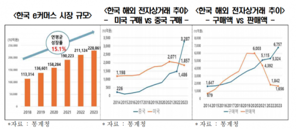 2023년 한국의 중국 e커머스 플랫폼을 통한 구매액은 3.3조원(2022년 대비 121.2% 증가)으로 미국(1.9조원)을 크게 상회했다. 미국은 관련 통계가 작성된 2014년 이후 줄곧 한국의 최대 e커머스 구매 국가였으나, 작년 중국에게 처음으로 역전 당했다. 한국의 해외 전자상거래는 2021년을 기점으로 구매액이 판매액를 앞질러 적자 전환되었으며 2023년에는 적자 폭이 △5.1조원에 달하는 것으로 나타났다.