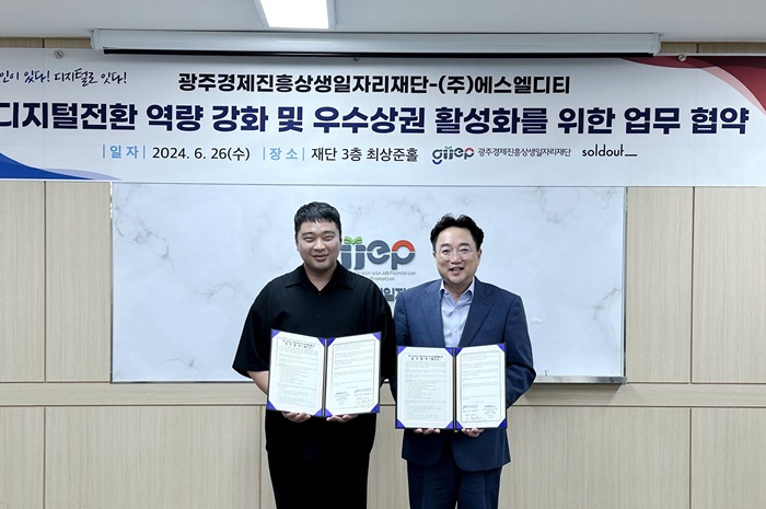 솔드아웃을 운영하는 에스엘디티(SLDT)는 재단법인 광주경제진흥상생일자리재단(이하 광주경제일자리재단)과 ‘소상공인 디지털 전환 역량 강화 사업에 관한 업무협약(MOU)’을 지난 26일 체결했다. 이날 광주시 도천동 광주경제일자리재단 사무실에서 열린 협약식에는 광주경제일자리재단의 김현성 대표이사와 SLDT 신희운 사업실장이 참석했다.