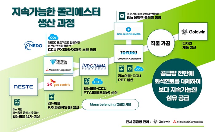 SK지오센트릭은 핀란드 최대 석유기업 네스테, 태국 석유화학기업 인도라마 벤처스, 일본 스포츠의류기업 골드윈 등 6개 글로벌 기업들과 바이오 기반 공정 부산물인 팜잔사유와 폐식용유 등에서 추출한 ‘리뉴어블 나프타’를 원료로 폴리에스터를 생산해 냈다고 밝혔다.