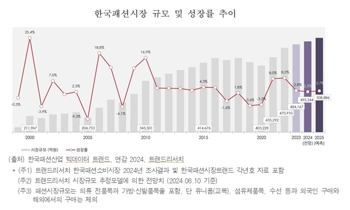 시장조사기관 트랜드리서치(www.trendmr.com)가 주관하는 ‘한국패션산업 빅데이터 트랜드 2024’ 연감에 의하면, 2023년 한국패션시장 규모는 전년 대비 2.8% 신장한 48조 4167억 원을 기록했다. 이는 역대 최대 규모이고, 코로나 사태 직전인 2018년 43조 2천억 원보다 5조 2천억 원 상승한 것이다. 그러나 하반기의 급격한 소비침체로 전망치보다는 성장 폭이 하락했고, 2024년과 2025년에도 각각 2.3%, 2.7% 수준의 저성장 기조를 이어갈 것으로 전망했다.