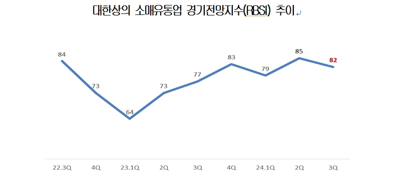 대한상공회의소(회장 최태원)는 500개 소매유통업체를 대상으로 3분기 소매유통업 경기전망지수(RBSI)’를 조사한 결과, 전망치가 ‘82’로 집계됐다고 9일 밝혔다.
