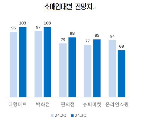 업태별로는 체감경기 전망에 희비가 엇갈렸다. 대형마트(103)와 백화점(103)이 기준치(100)를 웃돌며 전체 지수 상승을 견인했고, 편의점(79→88), 슈퍼마켓(77→85)도 개선된 기대감을 보였다.