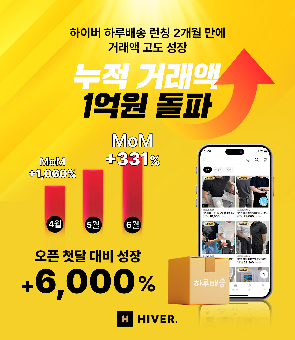 하이버가 런칭한 하루배송 서비스가 두 달 만에 누적 거래액 1억 원을 돌파했다. 하루배송 서비스는 4월 첫 거래액이 2백만원에서 시작해 6월에는 8천2백만원으로 급상승, 각각 1060%와 331%의 월간 성장률을 기록했다. 이는 첫 달 대비 누적 성장률 약 6000%에 달하는 수치로, 하루배송 서비스가 시장에서 큰 호응을 얻고 있음을 보여준다.