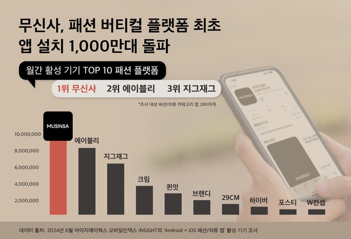 무신사가 모바일 빅데이터 플랫폼 기업 아이지에이웍스의 데이터 분석 솔루션 ‘모바일인덱스 INSIGHT’를 조사한 결과, 2024년 6월 기준 무신사 모바일 앱 활성 기기는 약 1022만 대로 집계됐다. 이는 양대 모바일 운영체제(OS)인 안드로이드(Android)와 애플의 iOS에서 무신사 앱이 설치된 기기를 집계한 것이다.