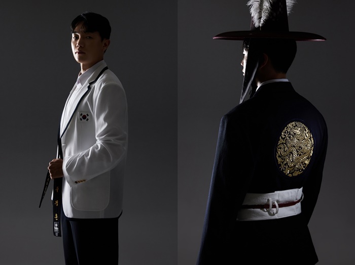 디자인은 한국 전통미를 현대적으로 재해석해 클래식한 멋을 살린 점이 특징이다. 재킷은 태조 이성계의 곤룡포에서 영감을 받아 네이비 트리밍과 오조룡 금속 단추, 단청 문양의 싸개 단추로 포인트를 줬다. 남녀 구분 없이 사용할 수 있는 페도라는 태극무늬 띠를 둘렀으며, 타이와 댕기에도 단청 문양을 활용했다.