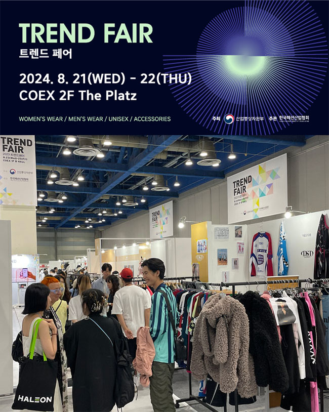 한국패션산업협회(회장 성래은, 이하 ‘협회’)는 산업통상자원부(장관 안덕근)의 지원으로 오는 8월 21일(수)~22일(목), 코엑스 2층 더플라츠에서 '2024 트렌드페어(Trend Fair 2024)'를 개최한다. 이 행사는 글로벌브랜드육성사업의 일환으로 산업부가 섬유패션산업의 경쟁력 강화를 목적으로 추진하는 섬유 패션 기술력 향상 및 패션산업 지식 기반화 구축 사업의 내역사업으로 협회 주관으로 추진하고 있다.