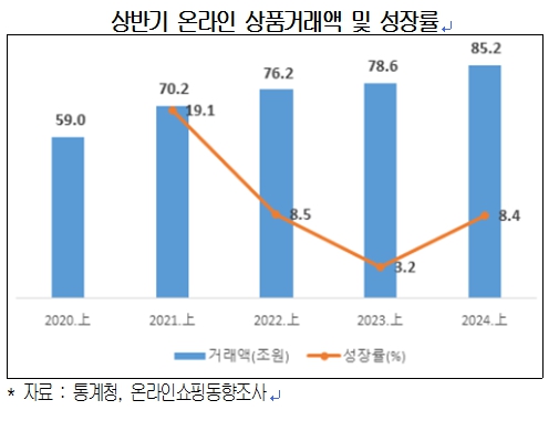 온라인쇼핑 거래액에서 여행, 레저 등 서비스 거래액을 제외한 상품거래 실적은 올해 상반기 85.2조원으로, 전년 동기 대비 8.4% 늘어났다. 상품거래액은 코로나 기간 동안 폭발적으로 성장하면서 ’21년 상반기에 19.1% 성장했으나 ’22년 8.5%, ’23년 3.2%로 성장률이 내려앉았다가 올해 8.4%로 반등하는 분위기다.