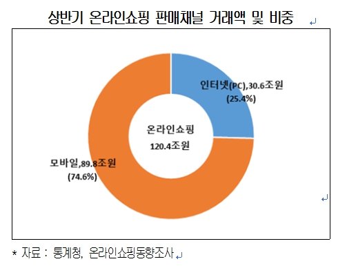 판매매체별 온라인쇼핑 거래액을 살펴보면, 모바일을 통한 거래 규모는 89.8조원(74.6%)인 반면, PC를 통한 거래는 30.6조(25.4%)원으로 모바일쇼핑 규모가 PC쇼핑 대비 3배에 달하는 것으로 나타났다.