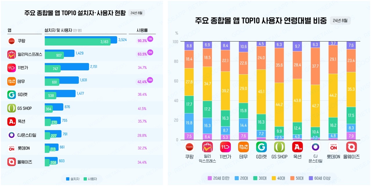 전반적으로 여성의 비중이 높은 가운데 홈쇼핑 기반인 GS SHOP, CJ온스타일과 올웨이즈는 여성 사용자가 특히 더 많고 알리익스프레스, 옥션은 남성 사용자 비중이 높은 특징을 보였다. 쿠팡을 제외한 모든 앱에서 4050 세대가 50% 이상을 차지했고 쿠팡, 알리, 테무 앱의 경우 비교적 전 연령에서 고루 사용했다.