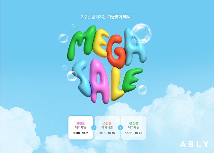 에이블리는 긴 여름을 지나 선선해진 날씨에 부담 없이 가을 쇼핑을 즐길 수 있도록 이번 행사를 마련했다. ‘브랜드 메가세일’(9월 30일~10월 7일), ‘쇼핑몰 메가세일’(10월 8일~10월 15일), ‘전 상품 메가세일’(10월 16일~23일) 순으로 세 차례에 걸쳐 진행된다. 각기 다른 개성의 패션 상품을 비롯해 뷰티, 라이프 상품까지 풍성한 할인 혜택은 물론, 다양한 고객 참여형 이벤트와 함께 만나볼 수 있다.