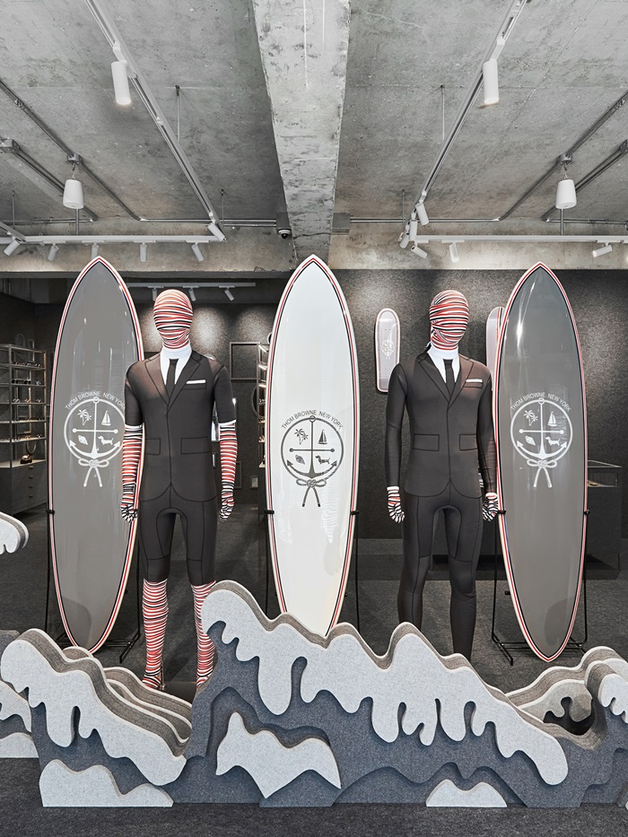 팝업스토어 안팎에 톰 브라운의 비전을 투영한 회색 플란넬 소재로 감쌌고, 장인정신과 테일러링, 예술의 세계를 3개층으로 차별화되게 구성했다.