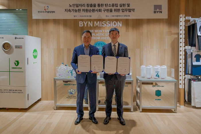 BYN블랙야크그룹(회장 강태선)이 노인 일자리 창출을 통한 탄소 중립 실현 및 지속 가능한 자원 순환 사회 구현을 위해 한국시니어클럽협회와 업무 협약을 체결했다.