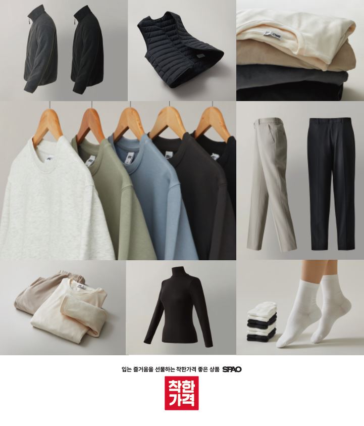 스파오 착한가격 라인업의 대표 상품으로는 ▲베이직 플리스 집업(19,900원) ▲와이드 플리스 팬츠(19,900원) ▲라이트 패쪼(19,900원) ▲WARM 긴팔티(9,900원) ▲웜테크(9,900원) 등이 있다.