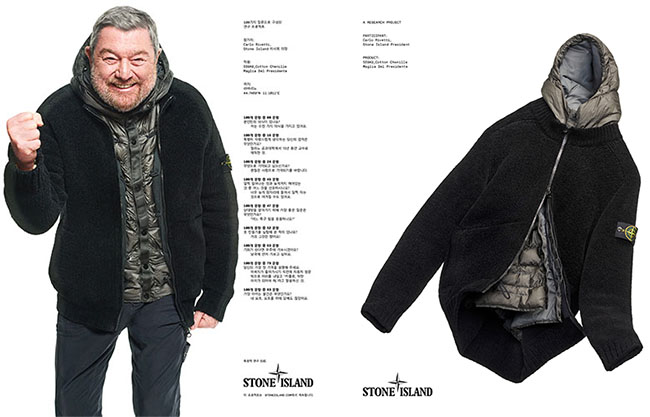 특히, 스톤 아일랜드의 회장 카를로 리베티(Carlo Rivetti)가 이 코튼 셔닐 재킷을 착용한 모습이 공개되어 주목을 받고 있다.