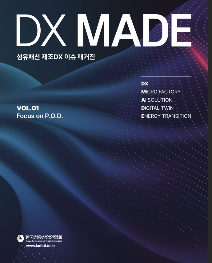 한국섬유산업연합회(회장 최병오, 이하 섬산련)는 섬유패션기업의 제조 분야 디지털 전환에 대한 인식을 확산시키고자, 제조 DX 우수 기업 및 혁신 사례를 소개하는 이슈 매거진 ‘DX MADE’를 발간했다.