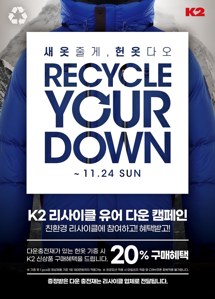 아웃도어 브랜드 ‘K2’가 안 입는 다운을 가져오면, 제품 구매 시 혜택을 제공하는 ‘리사이클 유어 다운(Recycle Your Down)' 캠페인 시즌 3를 진행한다.