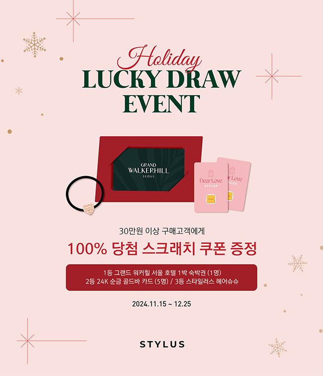백화점 매장에서만 진행되는 특별 프로모션도 마련되었다. 스타일러스는 백화점 매장 30만 원 이상 구매 고객에게 100% 당첨 스크래치 쿠폰을 증정, 깜짝 행운을 선사한다. 1등 1명에게는 그랜드 워커힐 서울 호텔 1박 숙박권을, 2등 5명에게는 24K 순금 골드바 카드를 증정하며, 3등 당첨자에게는 스타일러스 헤어슈슈를 한정 수량에 한해 증정한다.