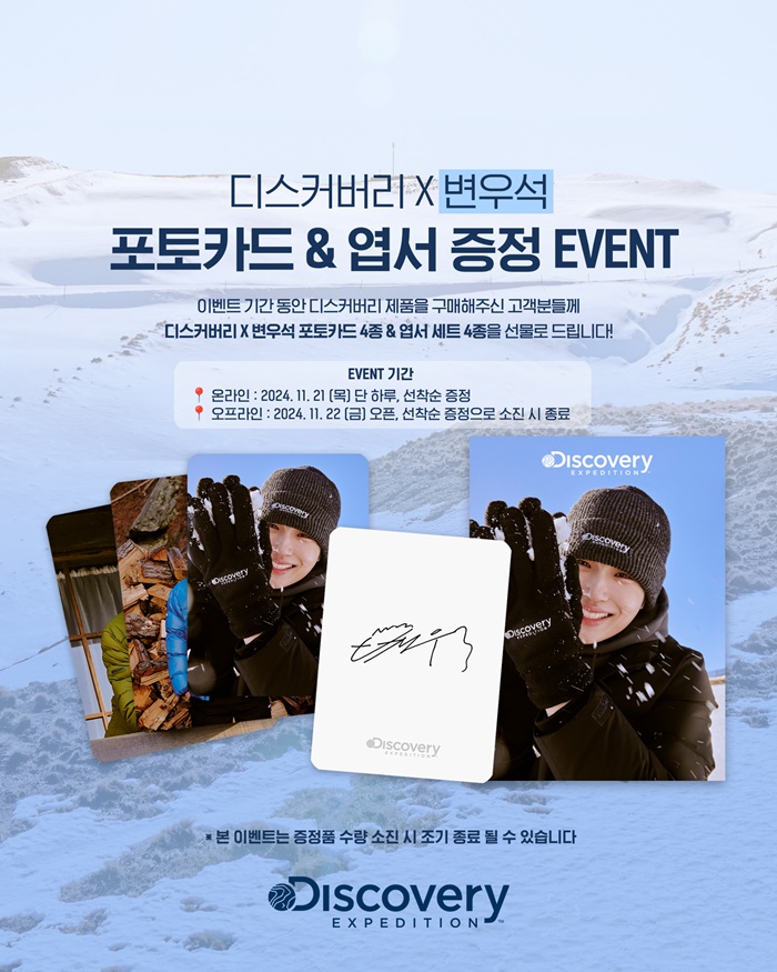 F&F(대표 김창수)가 전개하는 프리미엄 라이프스타일 아웃도어 브랜드 ‘디스커버리 익스페디션’이 본격적인 겨울 시즌을 맞아 특별한 고객 사은 이벤트를 진행한다. 이번 이벤트는 디스커버리 온오프라인 매장에서 제품을 구매한 고객에게 ‘디스커버리 X 변우석’ 콜라보레이션 포토카드(4종)와 엽서 (4종)로 구성된 한정판 기프트 세트를 선착순으로 증정하는 행사로, 겨울 아웃도어 여행의 특별한 감성을 고객들에게 전달할 예정이다.