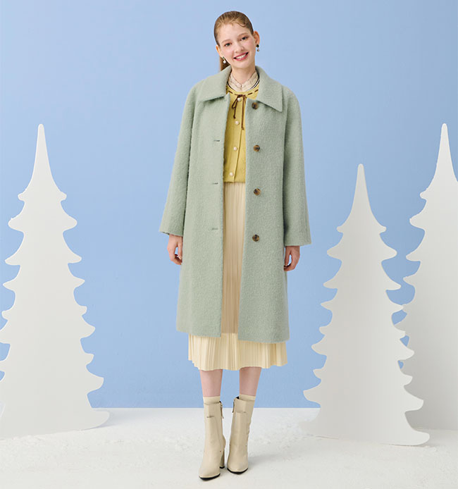 울 블랜디드 롱코트는 울 혼방 소재 코트로 보온성이 뛰어나며, 화사한 민트 컬러와 헤어리한 텍스쳐로 포근한 무드를 연출할 수 있는 아이템이다. 아이보리 컬러의 롱 플리츠 스커트와 매치하면 로맨틱한 윈터룩을 연출할 수 있다.