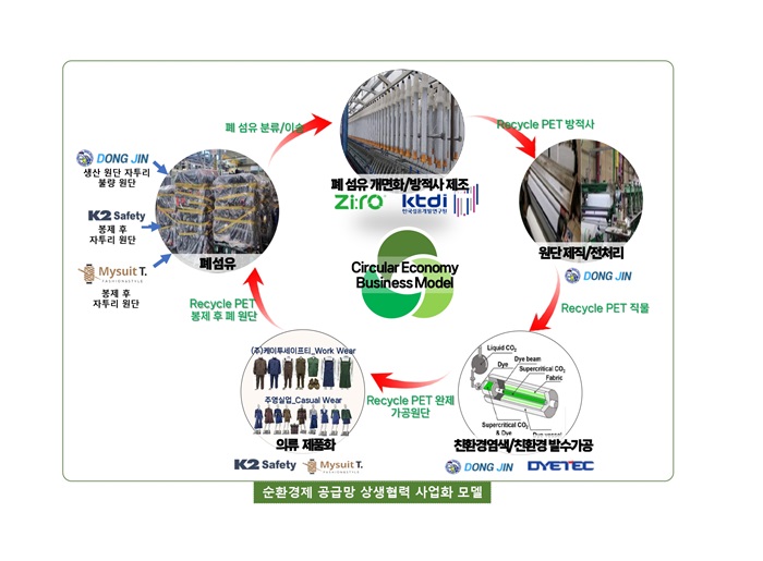 한국섬유개발연구원(원장 호요승, 이하 ktdi)이 자원 이용 효율을 높이고 순환경제 전환 촉진을 위해 수요-공급 기업간 순환경제 공급망 상생협력 모델을 구축했다. 동진상사(대표 조원준), 지로(대표 이영준), 주영실업(대표 이재혁), 케이투세이프티(대표 정영훈), DYETEC연구원(원장 홍성무) 및 ktdi 등 총 6개 기업과 기관 컨소시엄이 생산과정에서 발생한 불량원단과 버려지는 폐의류의 수거, 이송, 분류, 해체 작업을 거쳐 재자원화(섬유화)하는 자원순환 시스템을 조성한 것이다.