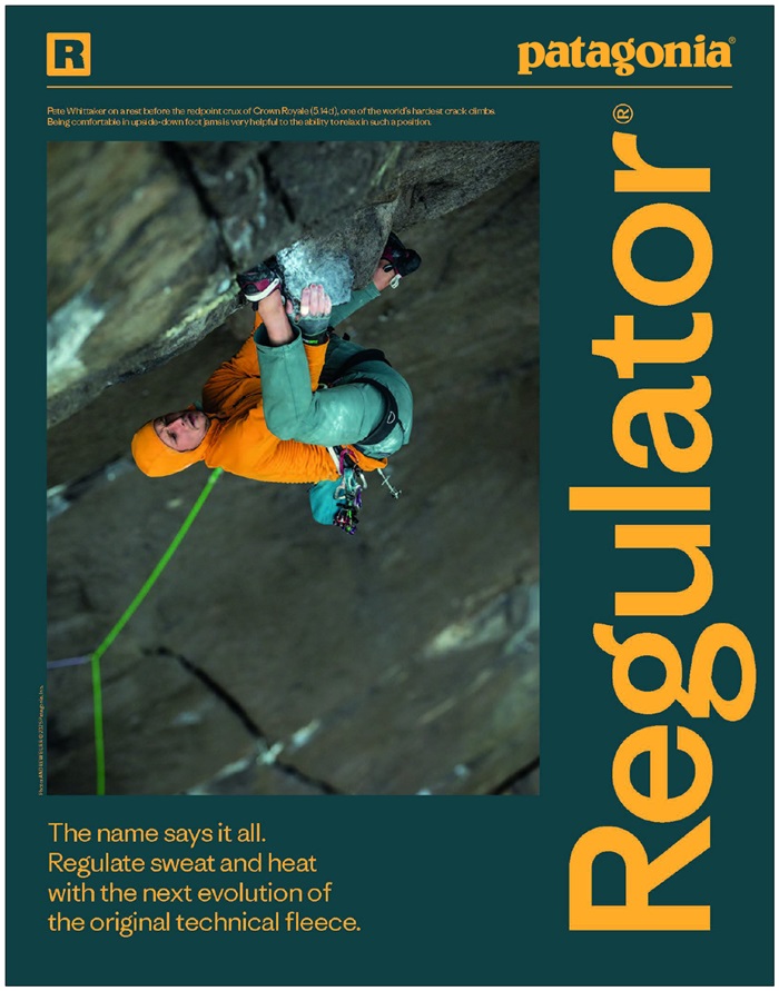 1999년, 파타고니아는 폴라텍(Polartec)사와 원단을 공동 개발해 최초의 레귤레이터(Regulator) 플리스를 출시했으며, 이후 25년간 품질과 성능을 꾸준히 개선해왔다. 레귤레이터 플리스는 제품명처럼 체온을 적절히 조절해 편안함과 쾌적함을 제공하는 것이 특징으로, R1, R2, R3, R4등 다양한 환경과 활동에 적합한 제품군으로 오랜 시간 사랑받고 있다