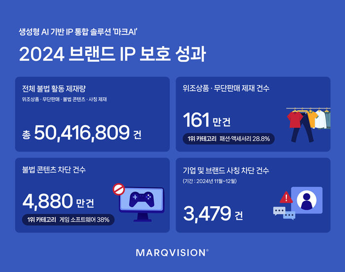 AI 기반 IP 통합 솔루션을 제공하는 마크비전(대표 이인섭)은 자사 대표 솔루션 ‘마크AI’를 통해 지난해 위조상품과 무단판매, 불법 콘텐츠, 브랜드 사칭 등 각종 브랜드 IP(지식재산권) 위협에 대한 제재 성과를 25일 발표했다.