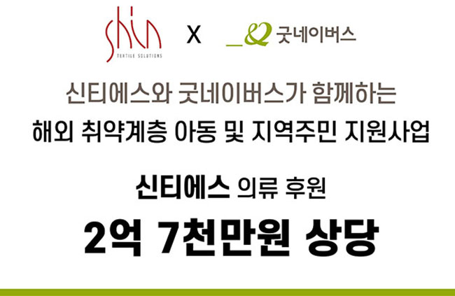 세계적인 아웃도어 의류 제조기업 신티에스(대표 차종인)가 지난 1월 글로벌 아동권리 전문 NGO 굿네이버스에 2억 7천만 원 상당의 의류를 기부하는 등 지속적으로 사회공헌 활동을 펼치고 있다.