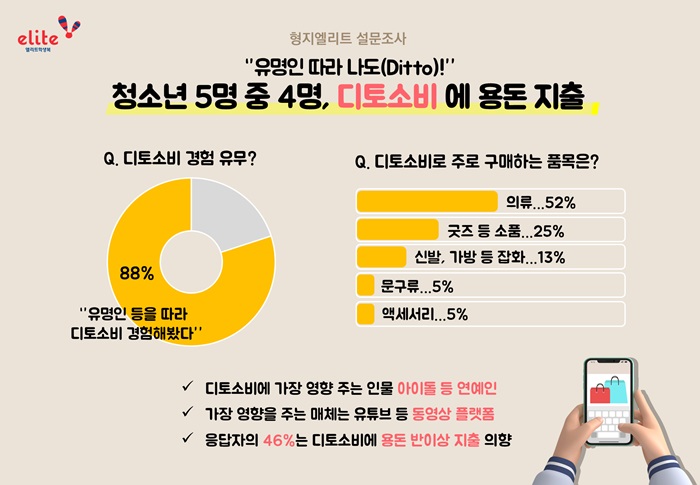 형지엘리트(대표 최준호)의 학생복 브랜드 ‘엘리트학생복’이 지난 1월 22일부터 2월 10일까지 20일간 중고생 258명을 대상으로 추구미와 디토소비 트렌드 관련 설문 조사를 실시한 결과, 응답자의 5명 중 4명 꼴인 88%가 특정 인물이나 콘텐츠 등의 영향을 받아 용돈을 지출한 경험이 있다고 답했다.