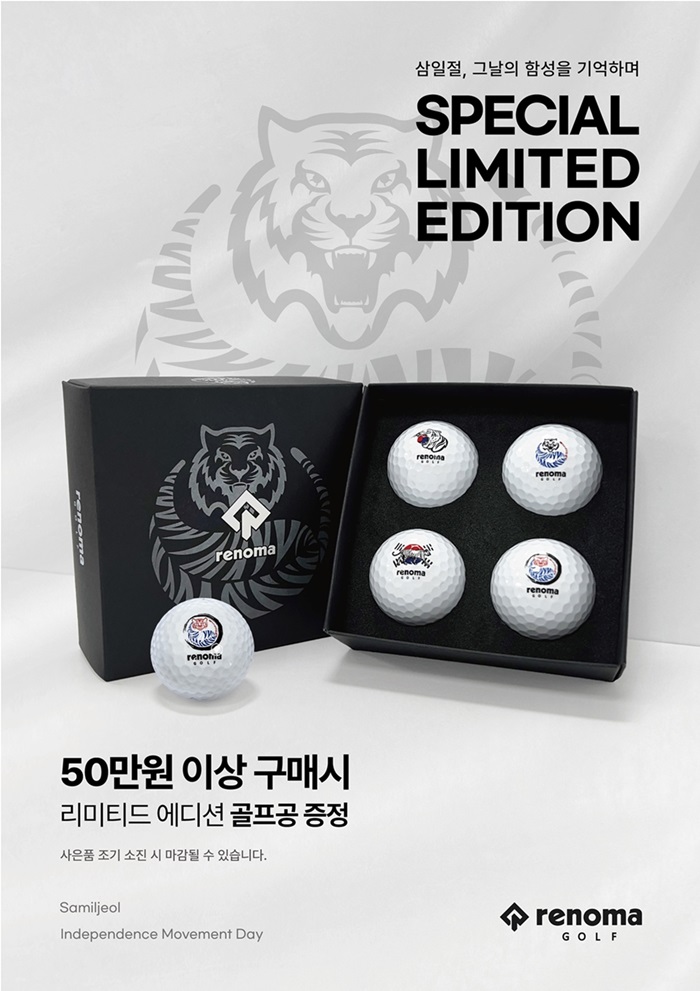 레노마 로고를 중심으로 태극 문양을 연상케하는 청색과 홍색의 호랑이 모습과 선명한 태극기 디자인이 삼일절 리미티드 에디션만의 특별함을 나타낸다. 레노마골프의 골프볼은 얇고 부드러운 신개념 특수 소재커버를 적용해 정확한 퍼포먼스 구현과 부드러운 타구감을 선사한다.
