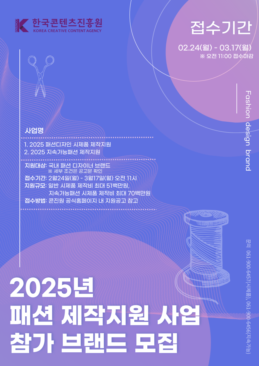 문화체육관광부(장관 유인촌)와 한국콘텐츠진흥원(원장직무대행 유현석, 이하 콘진원)은 ‘2025 패션디자인 시제품 제작지원 사업’과 ‘2025 지속가능패션 브랜드 제작지원 사업’에 참여할 브랜드를 오는 3월 17일까지 모집한다.