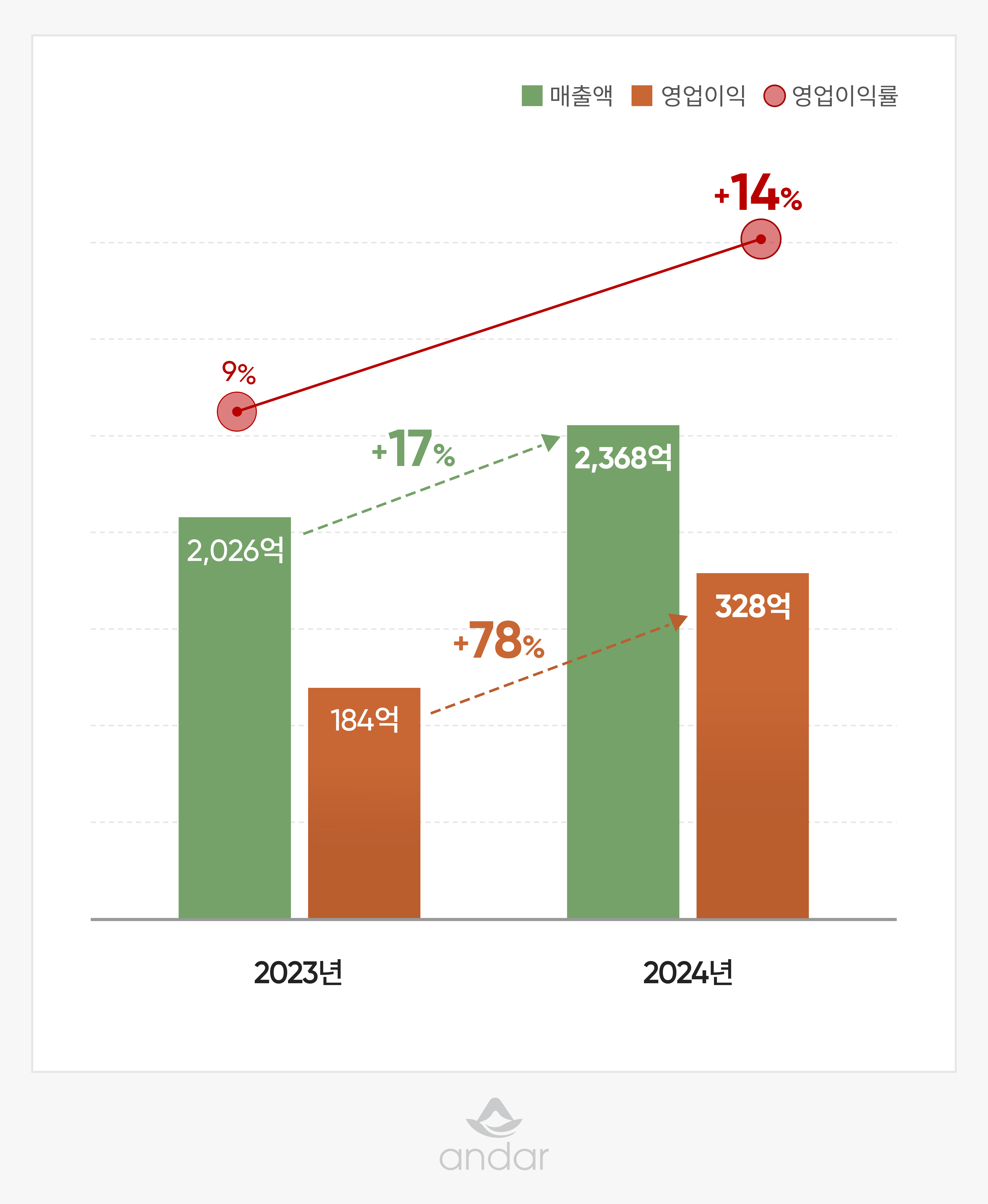 안다르는 지난해 영업이익이 전년 대비 78% 증가한 328억원을 기록, 독보적인 성장세를 보였다. 매출도 동기간 대비 17% 성장한 2,368억원을 달성하며, 역대 최대 실적을 갱신했다. 이에 힘입어 영업이익률 역시 2023년 9%에서 2024년 14%로 대폭 증가했다.