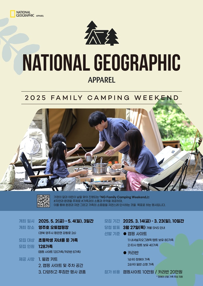 라이프스타일 전문 기업 더네이쳐홀딩스(대표 박영준)가 전개하는 ‘내셔널지오그래픽 어패럴’은 다가오는 가정의 달을 맞아 3월 14일부터 23일까지 10일간 도심을 벗어나(고아웃) 자연 속에서 가족과의 특별한 추억을 쌓아가는 ‘2025 내셔널지오그래픽 패밀리 캠핑 위크엔드’ 참가 가족을 모집한다고 14일 밝혔다. 지난해 시즌 1에는 70가족 선발 모집에 총 2366 가정이 지원, 34:1이라는 경쟁률을 기록하며 뜨거운 반응을 얻었다.