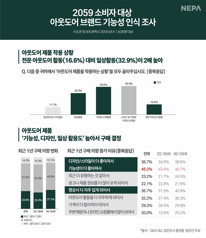 또 지난 1년간 아웃도어 의류 구매 의향이 증가했다는 응답은 전체의 34.8%로, 3명 중 1명 이상이 아웃도어 의류에 관심을 보인 것으로 나타났다. 구매 의향이 증가한 이유(중복 응답 가능)로는 ‘기능성이 향상되어서(45.2%)’가 가장 높은 비율을 차지했으며, 이어 ‘평상시에 더 자주 착용하게 되어서’와 ‘디자인과 스타일이 개선되어서’가 각각 36.7%로 뒤를 이었다.