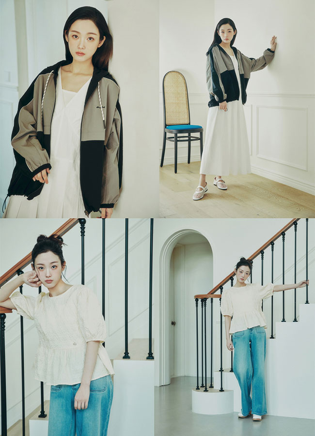 쥬시쥬디 모델 이유미는 특유의 표현력으로 브랜드 아이덴티티에 꼭 맞춘 다양한 스타일링을 완벽히 소화했다. 첫 번째 화보에서는 집업점퍼와 플리츠 롱 원피스를 믹스매치했다. 컬러블록으로 배색 포인트를 준 후드형 점퍼를 드레시한 원피스의 위에 레이어드해 여성스러우면서도 캐주얼한 상반된 매력을 표현했다. 사이드 포켓에 손을 넣고 벽에 가볍게 기댄 이유미의 모습은 도시적인 무드를 완성한다.