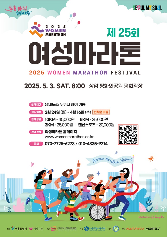 2001년 시작해 25회를 맞은 여성마라톤은 건강관리에 대한 사회적 관심을 촉구하기 위해 매년 개최되고 있는 국내 유일의 여성마라톤 대회이다. 올해 여성마라톤 대회는 2월 24일부터 4월 16일까지 접수를 진행하며, 5월 3일 서울 마포구 상암 평화의공원 평화광장에서 열린다. 누구나 여성마라톤 대회 홈페이지를 통해 참가신청이 가능하며, 참가 부문은 10km, 5km, 3km, 랜선스포츠 등 총 4가지이다.