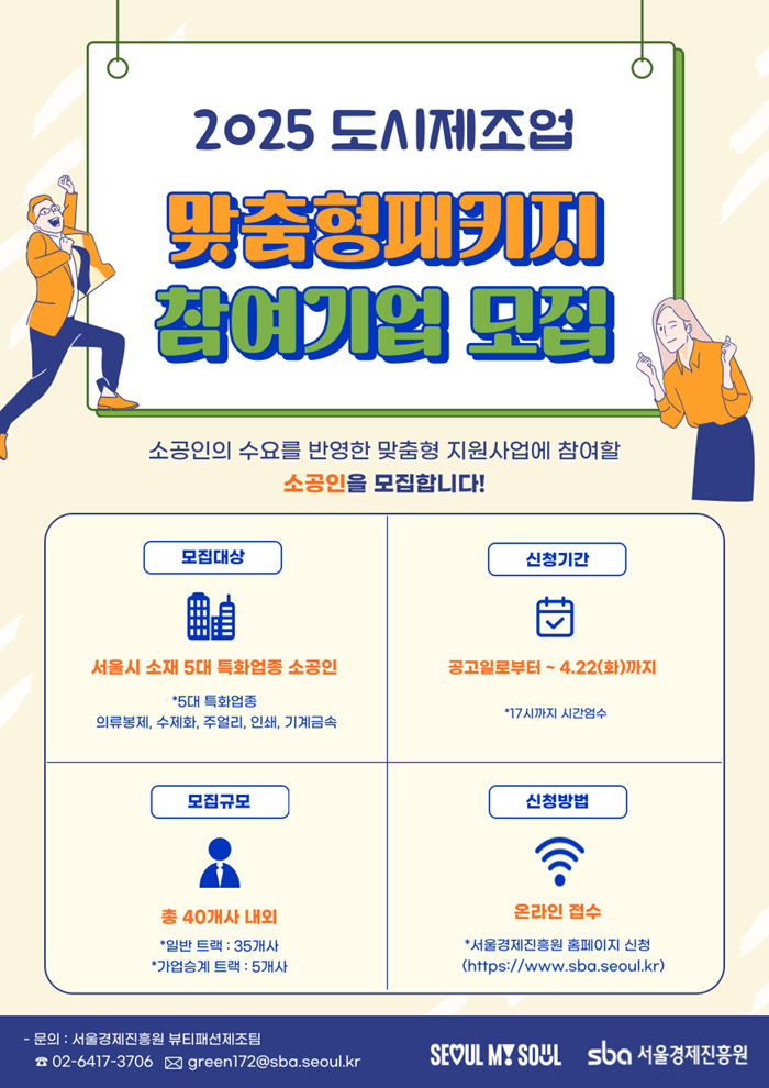 서울시와 서울경제진흥원(SBA, 대표 김현우)이 운영하는 서울도시제조허브는 도시제조업의 경쟁력 및 자생력 강화를 위해 ‘2025년 도시제조업 맞춤형 패키지 지원사업’에 참여할 소공인을 모집한다.